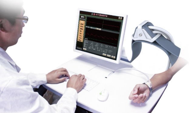 中醫(yī)脈象診斷系統(tǒng):利用計算機,通過袖帶式傳感器,傳感器自身重量≤50克,在橈動脈寸,關(guān),尺三個部位檢測脈象信號,模仿中醫(yī)醫(yī)師指法,(傳感器Φ8圓形)更準(zhǔn)確的按照中醫(yī)舉、按、尋的診脈過程,浮、中、沉散布全自動氣體加壓取脈,采集八個不同壓力段的脈象波形自助選擇佳壓力波形,并將脈象的位,數(shù),形,勢和脈圖的各項參數(shù)自動分析,以判定脈象信息,用于臨床脈象檢測。
